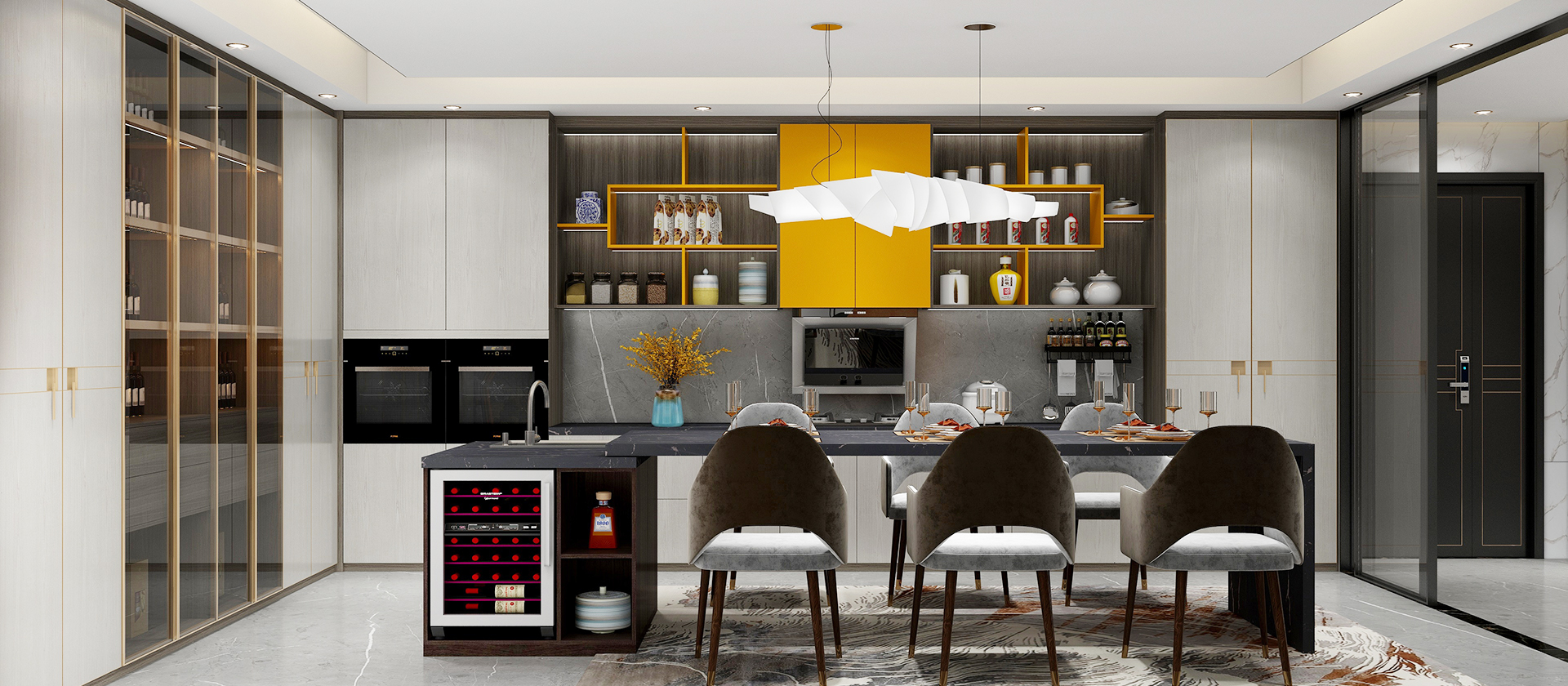 1、定制酒柜可以不需要很大的酒窖空間,但一定要精致美觀,金屬門把手,輕奢的感覺馬上就出來了,透明的玻璃,更有美感。成為家中一道美麗的風景。 2. 房間小家庭通常是一個單字酒柜設計,用酒瓶、中國飾品等裝飾,集收納和展示功能于一體,突出了整個家庭空間的和諧之美。 3.酒柜和餐邊柜的設計結合白色和棕色的顏色搭配,讓居家生活更有情調,生活品味顯現,餐廳看起來充滿質感。 4、簡約大氣的酒柜,總